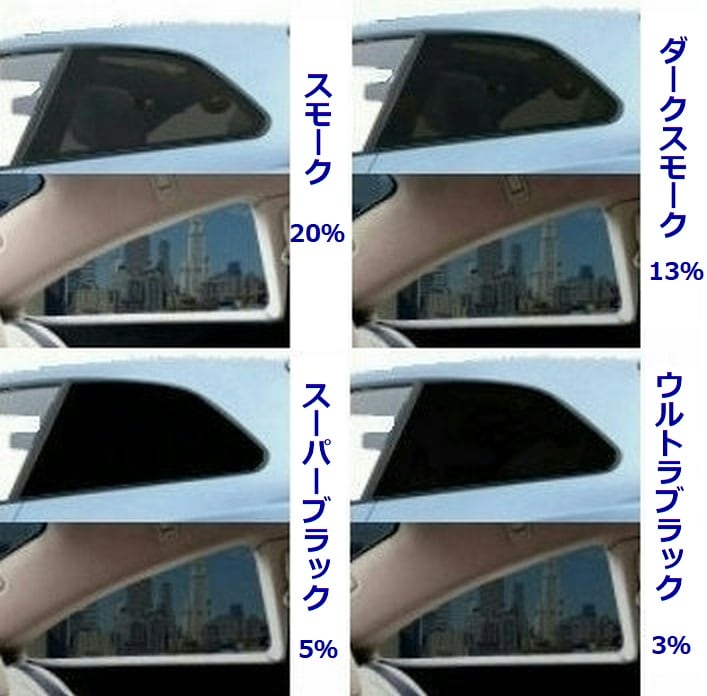 フィルムカラースモーク20%、ダークスモーク13%、スーパーブラック5%、ウルトラブラック3%をご指定下さい。