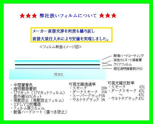 フィルムカラー:ダークスモーク13%、スーパーブラック5%、ウルトラブラック3%の中からお選び下さい。
